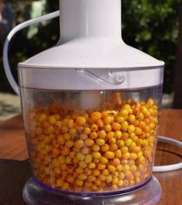 Duindoorn geoogst voor de winter zonder warmtebehandeling is ongelooflijk nuttig. Het kan bijvoorbeeld worden gehakt en gemalen met suiker. Als gevolg hiervan kan een dergelijke blanco worden toegevoegd aan thee of gemaakte fruitdrank.