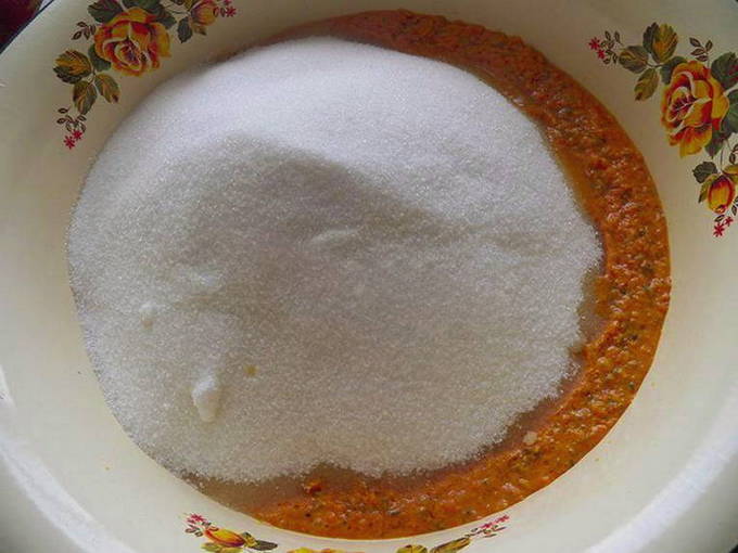 - Voeg vervolgens suiker toe aan het sap en roer tot het volledig is opgelost. Je kunt dit geleidelijk doen, elke 30-40 minuten terugkeren naar de gelei en een beetje roeren.