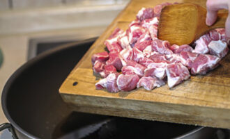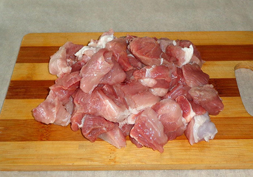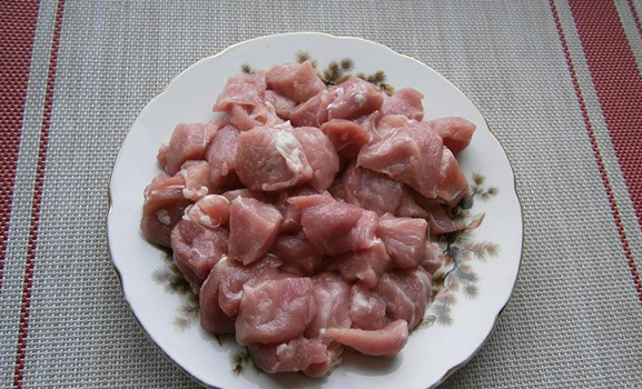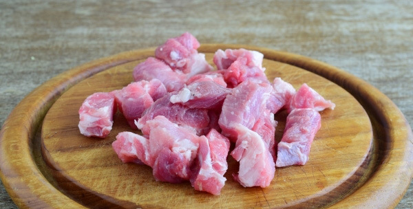 - Was het varkensvlees en snij in kleine blokjes. Bak het in plantaardige olie tot het goudbruin is.