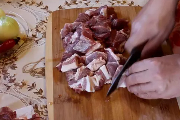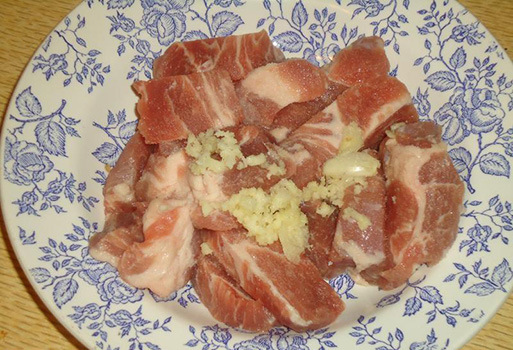 - Was het varkensvlees en snij in grote blokjes. Haal de knoflook door een pers en meng met het vlees.