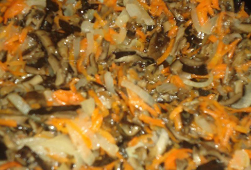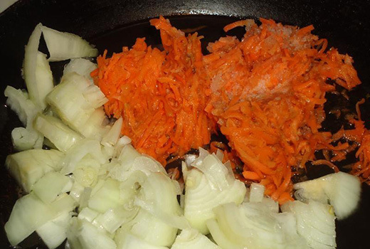 - Wortelen en uien, schillen en hakken. Bak groenten tot ze half gekookt zijn in plantaardige olie.