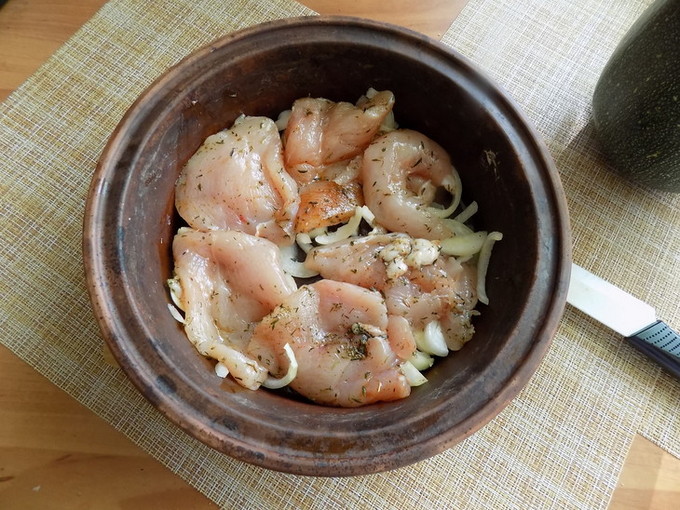 - Snijd het kippenvlees in porties, doe het in een kom, voeg olie, zout, peper, tijm, gesnipperde uien en knoflook toe, roer. Laat het vlees 45 minuten marineren.