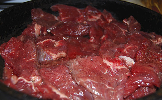 - Spoel het vlees af onder stromend water, snijd het in stukken, wrijf het in met zout en kruiden, doe het in een voorverwarmde pan en laat het op laag vuur sudderen.