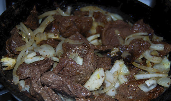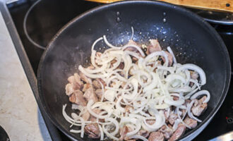 - Over een uur is het vlees bijna klaar. Voeg er gesnipperde uien aan toe in een koekenpan, bak 5-7 minuten.