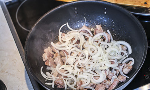 Pel de ui en snij in halve ringen. Voeg de ui toe aan het vlees in de pan, breng op smaak met zout en blijf bakken tot de ui zacht is.