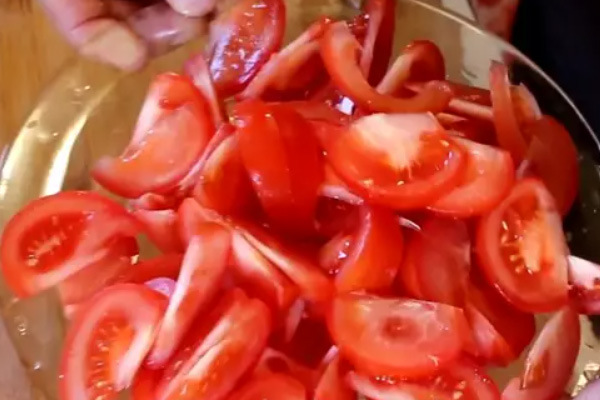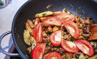 - Voeg vervolgens de in dunne plakjes gesneden tomaten toe, bak 5 minuten, voeg dan de gehakte kruiden en gehakte knoflook toe.