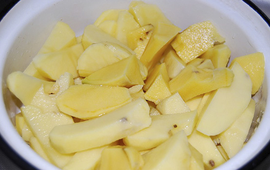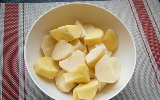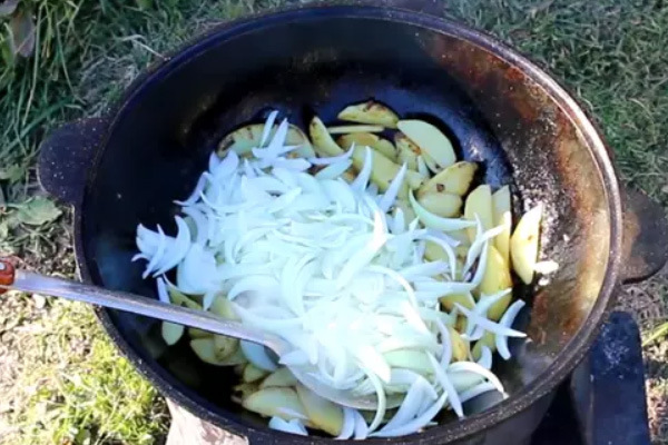 - Doe vervolgens aardappelen in een ketel, bak ze tot ze half gaar zijn. Voeg de ui toe en kook verder.