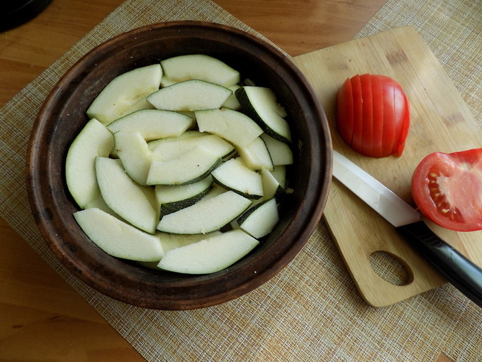 - Doe het gemarineerde vlees in ketsi, een speciaal gerecht voor het koken van ojakhuri. Was de courgette en snij in dunne lagen, leg deze op het vlees.