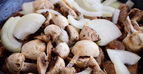 - Snijd de champignons en champignons in dunne plakjes. Doe champignons en uien in een pan bij het vlees, bak alles samen 5-7 minuten.