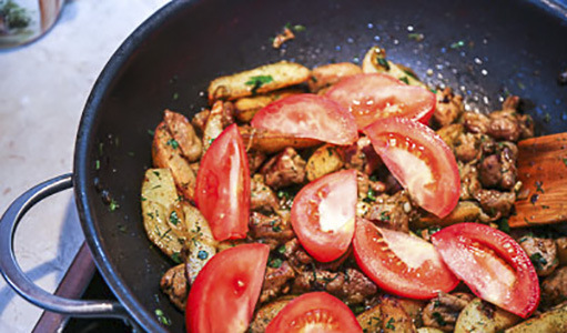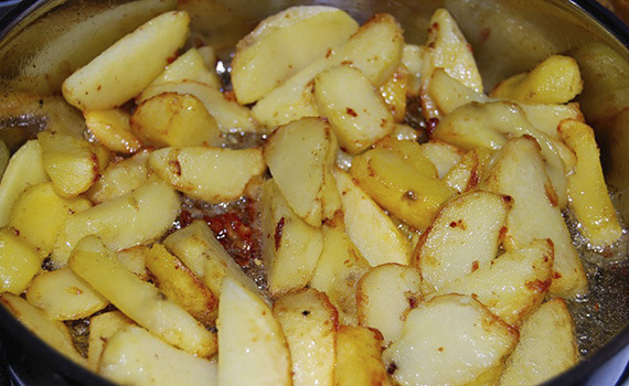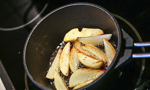 - Bak de aardappelen in een andere koekenpan tot ze gaar zijn.