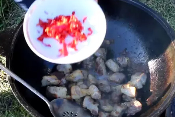 - Doe het vlees na 5 minuten weer in de ketel, roer en bak 8-10 minuten op hoog vuur. Voeg vervolgens gehakte knoflook, paprika, zwarte peper en zout toe.