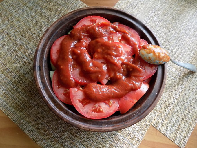- Leg de gesneden tomaat op het groentemerg. Top met tomatensaus.