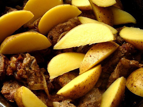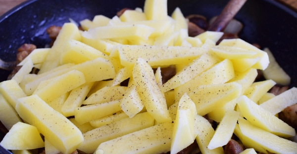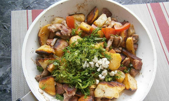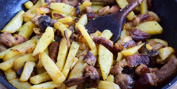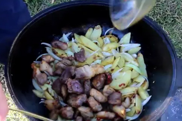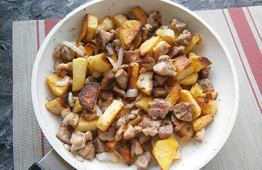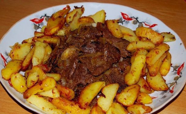 - Verhit plantaardige olie in een koekenpan, ketel of gietijzeren pan. Bak eerst het vlees tot het half gaar is. Voeg vervolgens de aardappelen toe, bak ze met het vlees gaar en zout op het einde naar smaak.