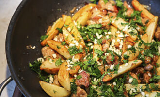 Doe de gebakken aardappelen in de pan met het vlees en de uien, voeg ook gehakte knoflook en gehakte kruiden toe aan de ingrediënten.