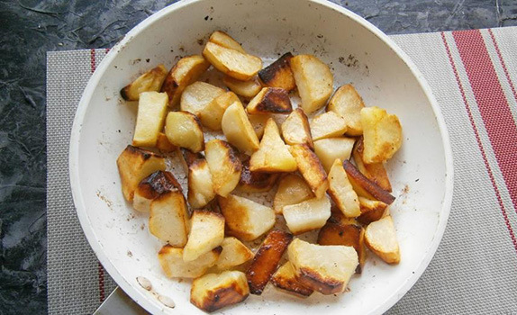 - Na een half uur vanaf het begin van het koken van het vlees, begin je de aardappelen in een andere pan te bakken. Als de aardappelen goudbruin zijn, breng op smaak met zout en breng op smaak.