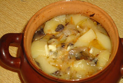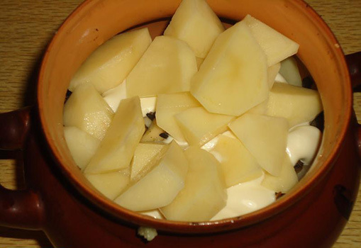 - Doe vlees, groenten en champignons in de potten. Leg vervolgens een laag gesneden aardappelen. Doe een beetje zure room, zout en kruiden in elke pot, giet er water in.