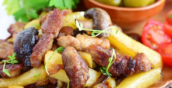 Een uitstekend gerecht van vlees en aardappelen met een smakelijke korst - zo ziet ojakhuri, gekookt volgens het klassieke recept, eruit. Om dit gerecht te transformeren, volstaat het om een beetje fantasie te tonen en champignons aan het gebraad toe te voegen.