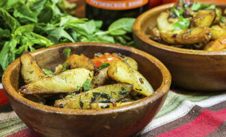 - Serveer hete ojakhuri bestrooid met gehakte kruiden.