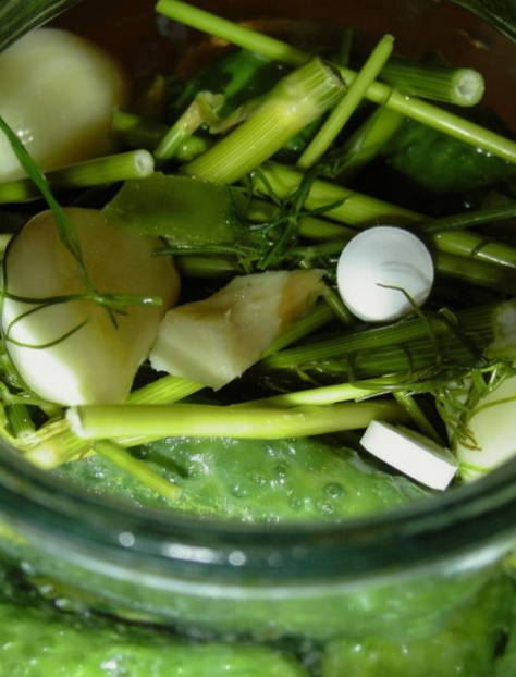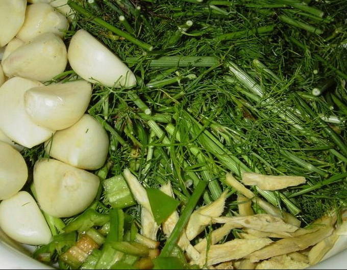 - Op de bodem van de pot verspreiden we alle bladeren die we hebben, en daarmee dilleparaplu's, knoflookteentjes, peperkorrels en kruidnagel. Voeg desgewenst een pepertje toe voor de scherpte.