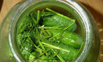 - Volg de kruiden, leg de komkommers neer en vul de pot er volledig mee.