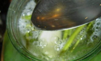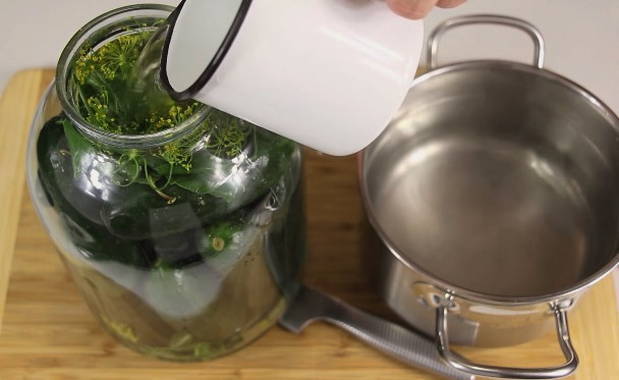 - Giet vervolgens onmiddellijk in potten met komkommers en laat 15-20 minuten staan, bedek de potten met deksels.
