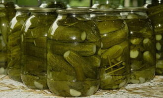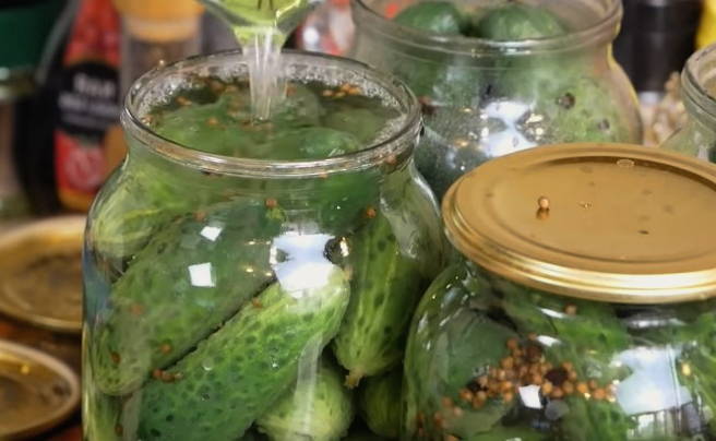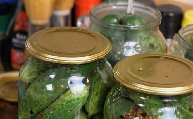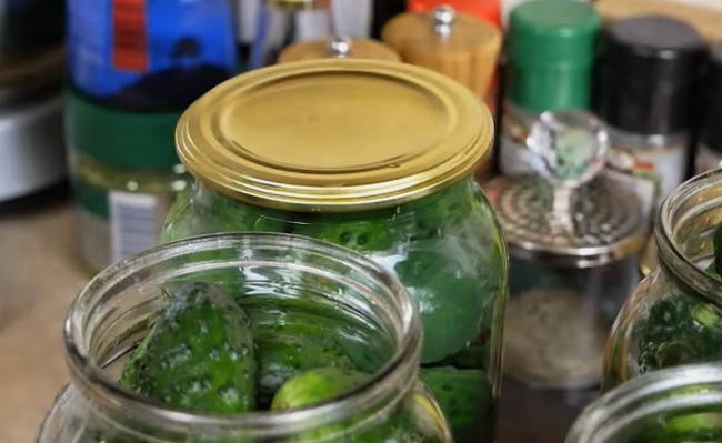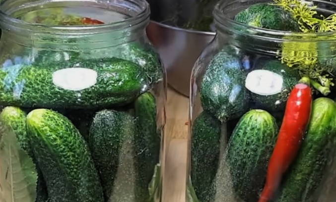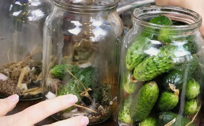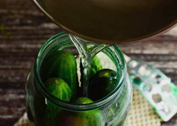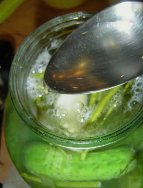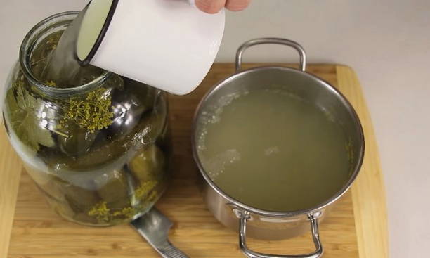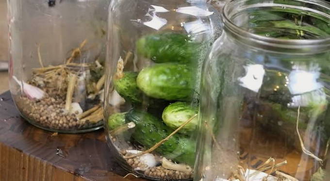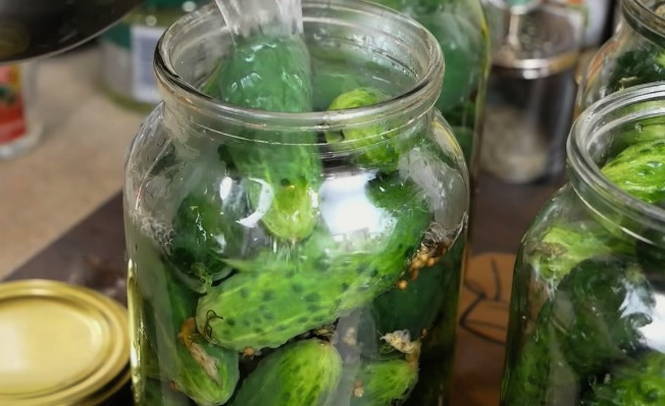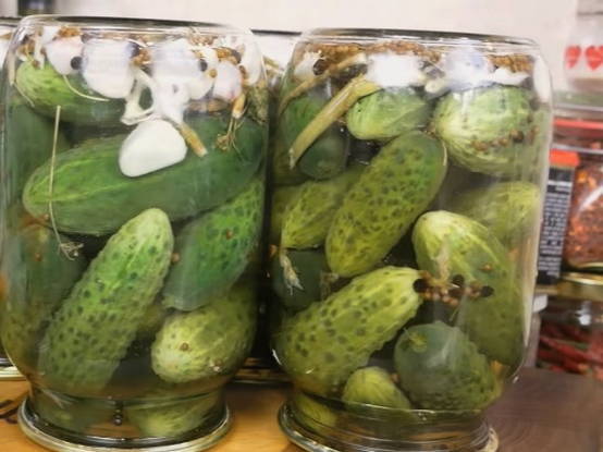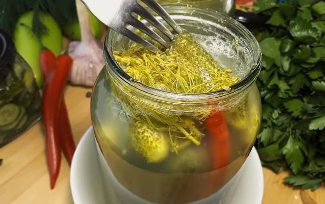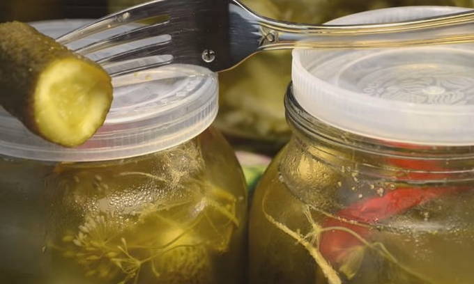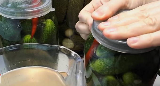 - Giet komkommers in potten met kant-en-klare pekel en vul ze tot de bovenkant.