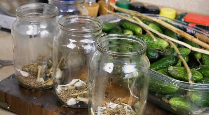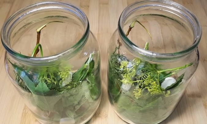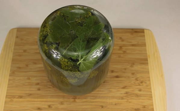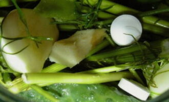 - Tegelijkertijd steriliseren we de potten en bereiden we de kruiden. Dan zetten we krenten, kersen, mierikswortelbladeren, ook knoflook met dille op de bodem.