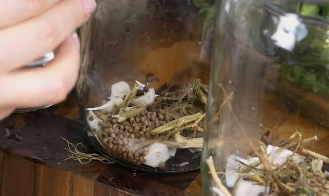 - Leg de gewassen kruiden, dille, knoflook en peperkorrels op de bodem van de gesteriliseerde potten.