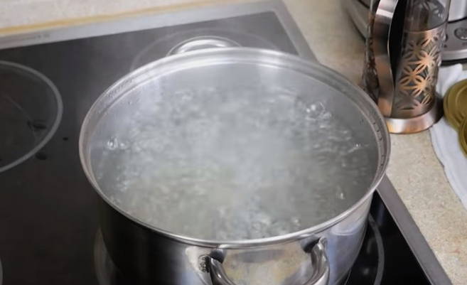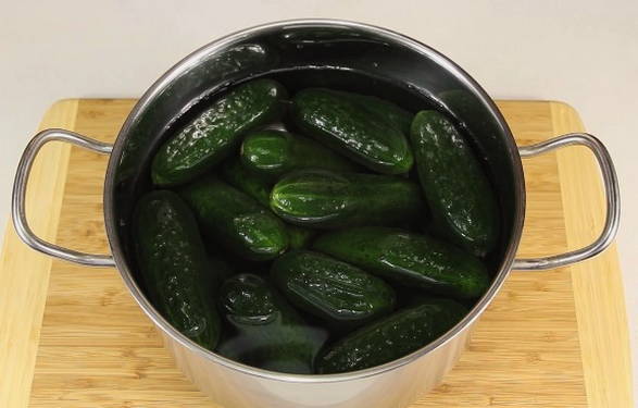 - Giet kokend water over de komkommers en laat 30 minuten staan, afgedekt met een deksel.