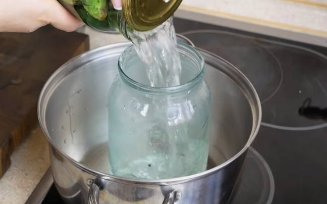 - Doe het kokende gezouten water terug in de pot met komkommers.