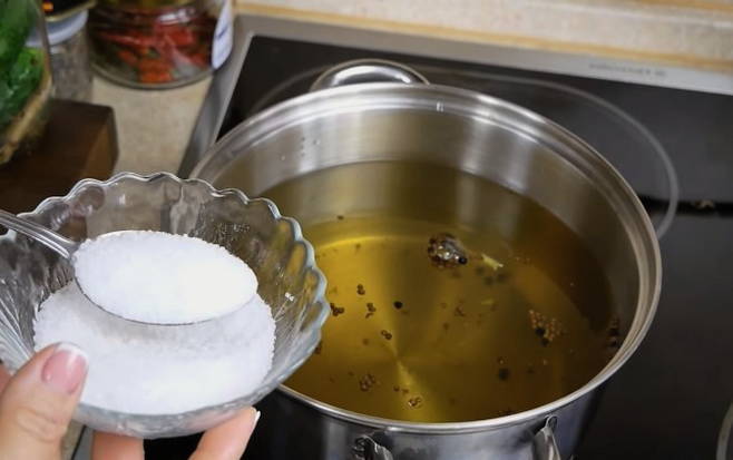 Nadat de potten volledig zijn gevuld, giet je er zout in en giet je koud water. We laten de inhoud een dag onder een gesloten deksel staan.