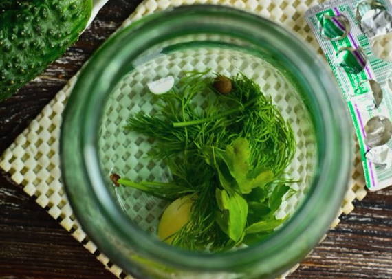 - Nadat de pot met het deksel is gesteriliseerd, gaan we verder met de hoofdfasen van de conserveringsvoorbereiding. Doe dille, peterselie, piment en aspirine op de bodem van de pot.