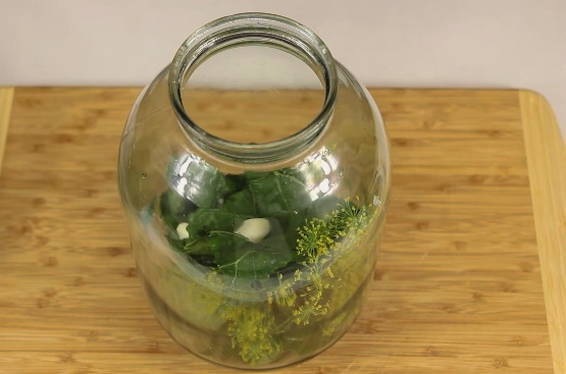 Op de bodem van de voorbereide pot beginnen we gewassen komkommers, mierikswortelbladeren, dille en knoflook te leggen. Het is beter om de componenten af te wisselen om lagen te maken.