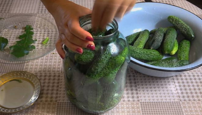 - Vervolgens doen we de voorbereide komkommers in een pot en drukken ze vrij strak tegen elkaar.