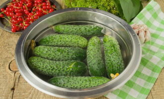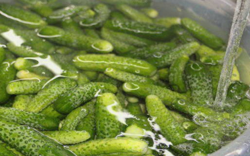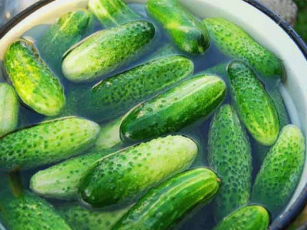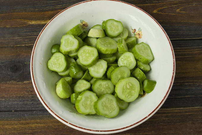 - Was de komkommers en verwijder de puntjes, snijd ze in de lengte door. Giet groenten met koud water en laat ze enkele uren trekken.