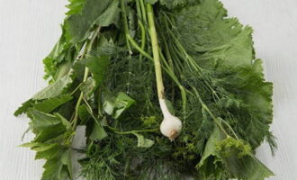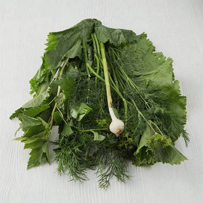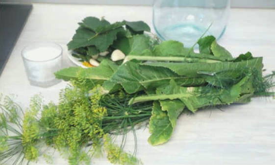 Doe dille, krentenblad, peterselie en mierikswortelblad in een weckpot. Voeg daar een teentje gepelde knoflook en kruiden toe.