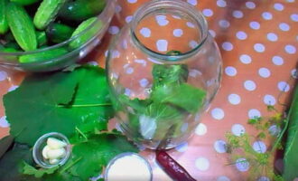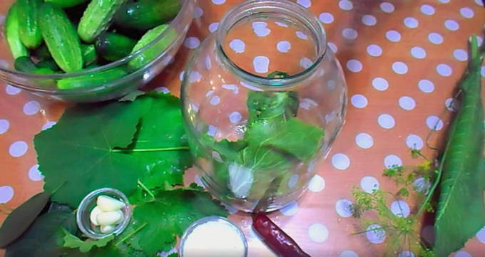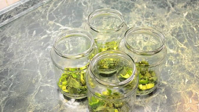 - Doe in gesteriliseerde potten kersen- en aalbessenbladeren, gepelde knoflook en chilipepers, die in grote stukken moeten worden gesneden, evenals piment.