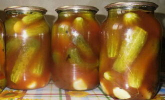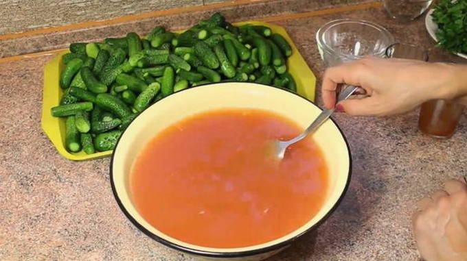 Kook water en giet het in een bak met komkommers, laat het 10 minuten afgedekt met een deksel staan. Giet het komkommerwater in een pan, doe er anderhalve theelepel zout in, evenals twee eetlepels chiliketchup en een suiker. Verwarm tot het kookt op hoog vuur, zet het vuur dan lager en laat het een paar minuten sudderen. Stop dan met verwarmen, voeg azijn toe en roer de resulterende marinade.