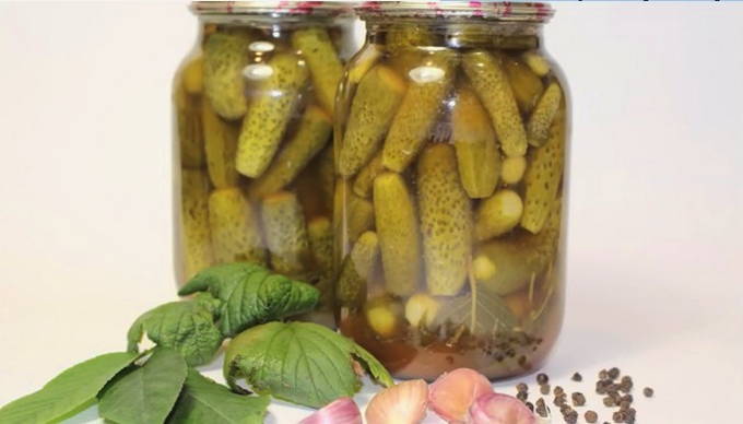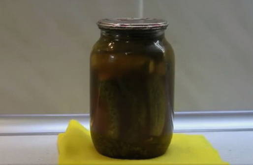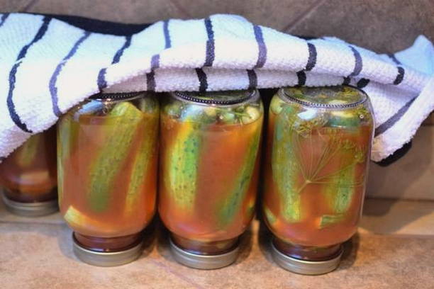 - Giet het water uit de blikken en giet in plaats daarvan de komkommers met de resulterende marinade. Kurk de werkstukken stevig aan, draai ze om en laat ze afkoelen in een warme kamer onder een deken. Bewaar de hartige komkommers vervolgens op een koele plaats.