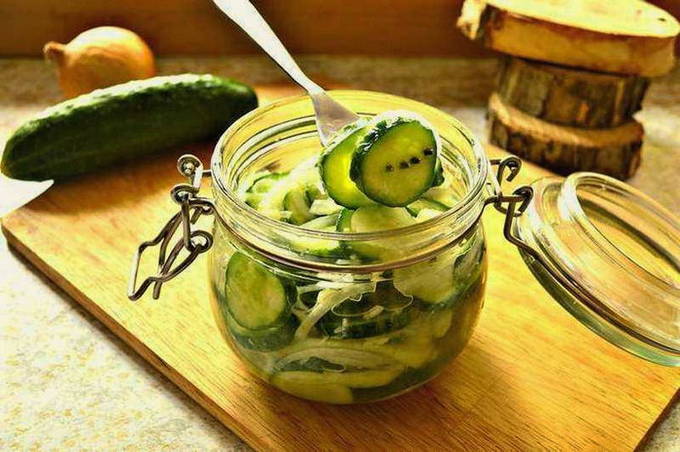 Deze komkommers worden favoriet op tafel, omdat ze knapperig en pittig zijn. Ze zijn handig om te serveren, omdat ze al zijn gesneden, en bovendien zijn ze in deze vorm beter verzadigd met marinade. Dergelijke komkommers worden zeer snel bereid en vereisen geen speciale kookvaardigheden.