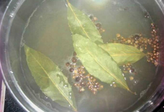 - Meng in een pan water met azijn, zout, suiker en ketchup, voeg peperkorrels en laurierblaadjes toe. Breng de marinade aan de kook en laat 15 minuten trekken.