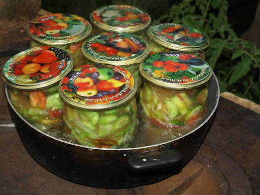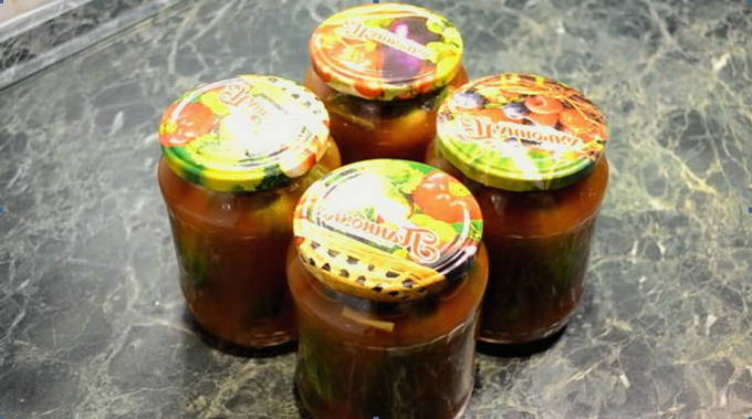 Giet de groenten in de potten met de geurige vloeistof tot aan de hals van de pot en sluit ze af. We laten de gekantelde werkstukken op een warme plaats achter en bedekken ze met een deken. Na volledig afkoelen, overbrengen voor permanente opslag in de kou.