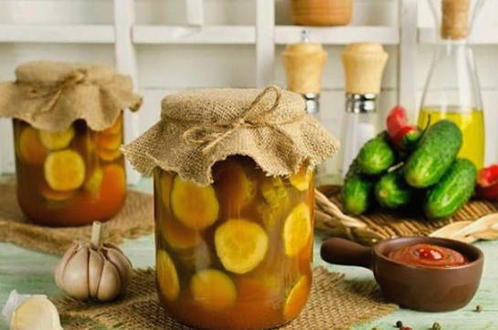 Komkommers volgens dit recept worden gebeitst zonder azijn, maar zijn tegelijkertijd knapperig en smakelijk. Chilipepers en ketchup voegen smaak, kruiden en pikantheid toe. Ze zijn gemakkelijk te bereiden en kunnen bij elke temperatuur worden bewaard.