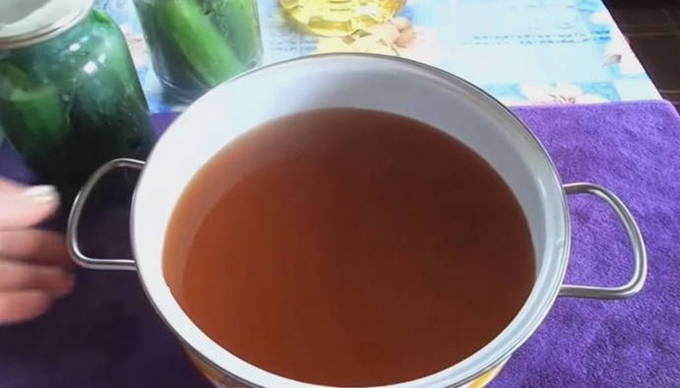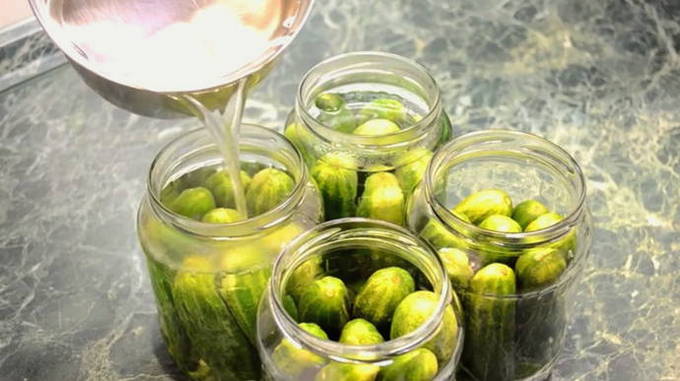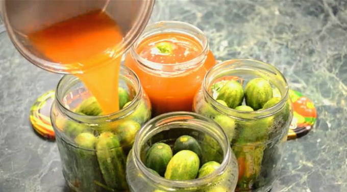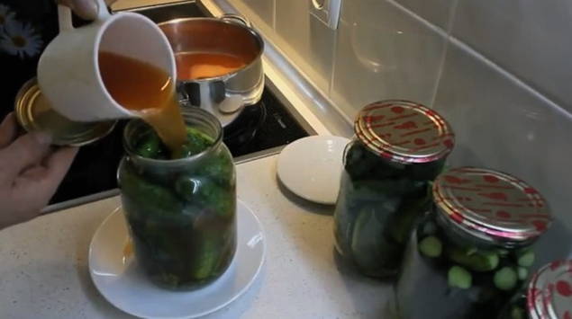 - Giet de resulterende hete oplossing in containers met komkommers en sluit af. Laat de broodjes afkoelen door ze eerst om te draaien, onder een deken in een warme kamer, en dan de komkommers opnieuw te rangschikken om ze in de kou te bewaren.