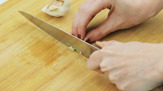 - Hak de knoflook fijn met een mes of rasp, doe komkommers in potten, bestrooi met knoflook.