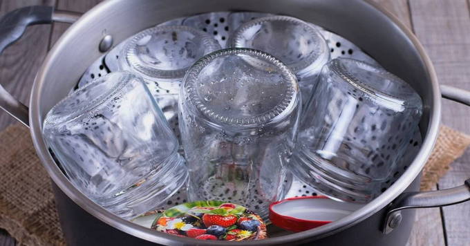 - Was en steriliseer potten. Om dit te doen, kunt u ze in de oven of magnetron houden, of een waterbad gebruiken. Giet kokend water over de deksels.