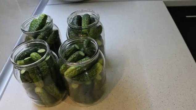 - Giet de marinade over de komkommers en dek af. Zet ze op sterilisatie en warm 15-20 minuten op met kokend water.