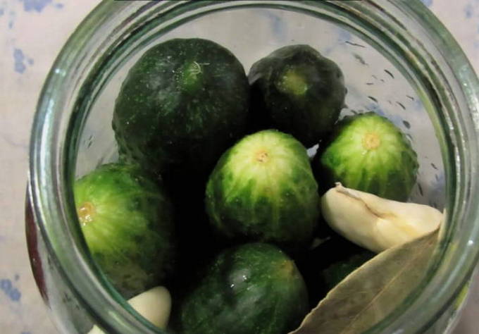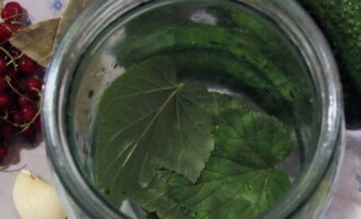 - Laat op de bodem van de voorbereide pot een krentenblad, een teentje knoflook, peper en eventuele kruiden naar smaak zakken.