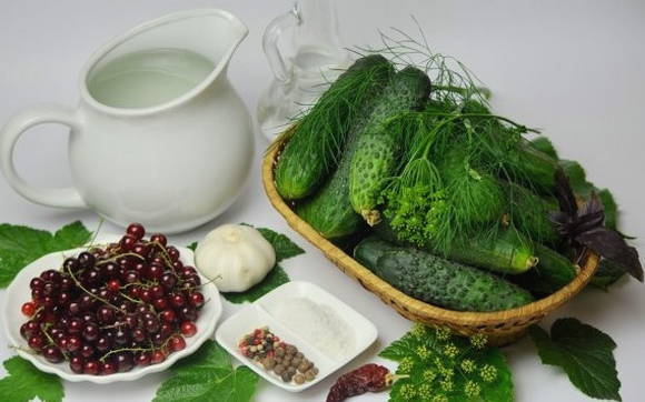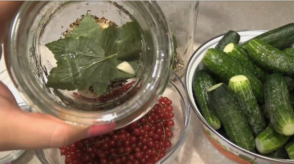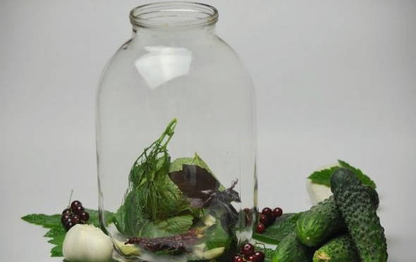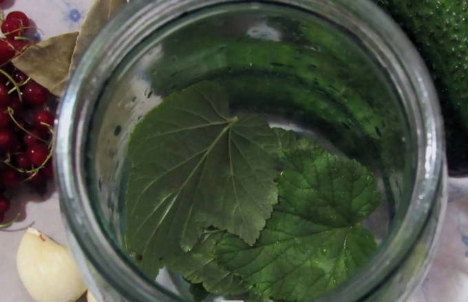 - Doe een vel mierikswortel, kersen, krenten en basilicum in de potten die zijn voorbereid voor het naaien. Daarna laten we de rode bes zakken zonder twijgen en komkommers.