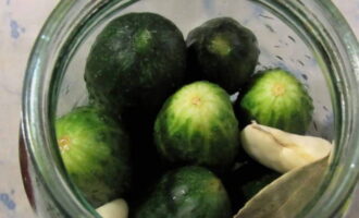 Na de bladeren leggen we de gewassen komkommers en drukken ze stevig tegen elkaar. En voeg in hetzelfde stadium peperkorrels toe met laurierblaadjes en knoflook.